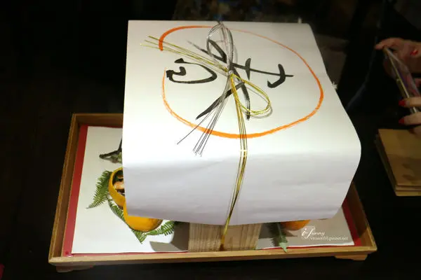 紙上的春字開宗明義的說明為春節料理。上方的「水引」為日本祝賀吉祥使用的繩結,