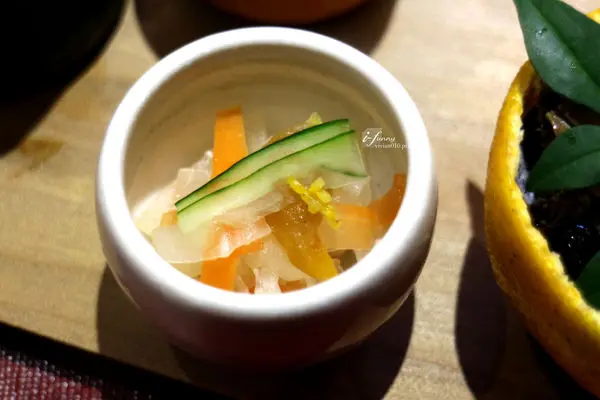 用紅白蘿蔔及柿子以甜醋漬成,紅白兩色也是日本祝賀用的喜慶色彩。