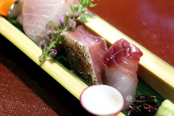 以當天進貨的季節時令魚為主,一旁搭配的是山葵泥、紅花及紫蘇花。