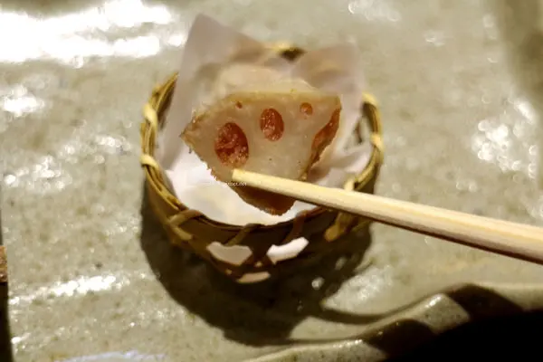 蓮藕內塞入明太子,蓮藕在日本象徵看見未來,配上明太子,象徵多子多孫。