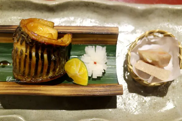 <松笠床節>以切成毬果狀的九孔,事先浸泡柴魚高湯、蘿蔔、醬油及味醂調配的醬汁,