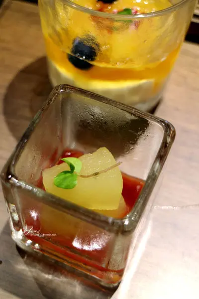 椰奶製作的慕斯搭柑橘果汁製成的寒天,加入藍莓、玫瑰果醬及薄荷,