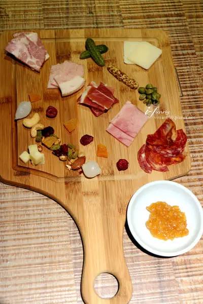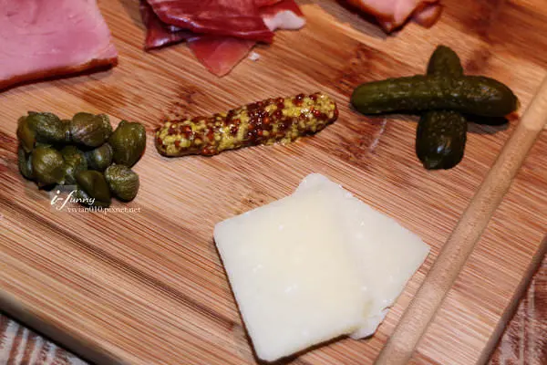 除了五款肉品之外,另附酸黃瓜、小洋蔥、堅果、水果乾、兩種起司及芥末籽醬。