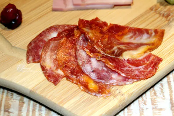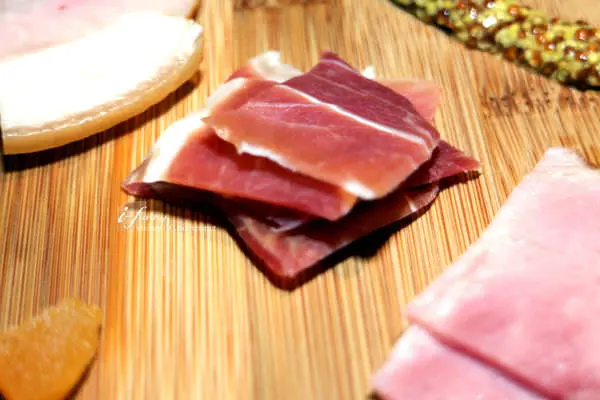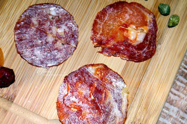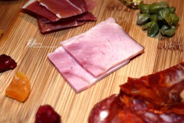 小丁狀的胡桃木煙燻火腿,採傳統古法純手工製作,經10天以上熟成鹽漬入味。