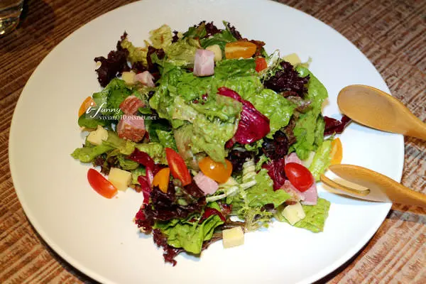 沙拉採用了許多不同的生菜及番茄,惟這天的葉菜類苦味較明顯,但油醋醬很爽口。