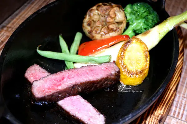 上桌時鑄鐵盤中仍滋滋作響,剖面的油花很漂亮,保留著肉汁與鮮嫩的口感。