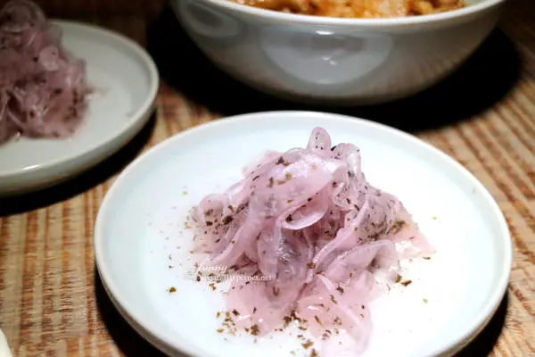 主廚特製紫蘇蘿蔔漬相當脆甜,帶著酸味也可解油膩。