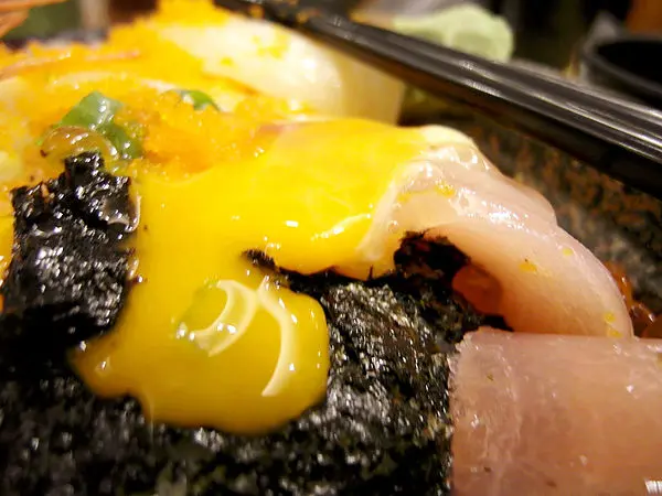 輕輕把生蛋黃用破之後伴著醋飯跟海苔