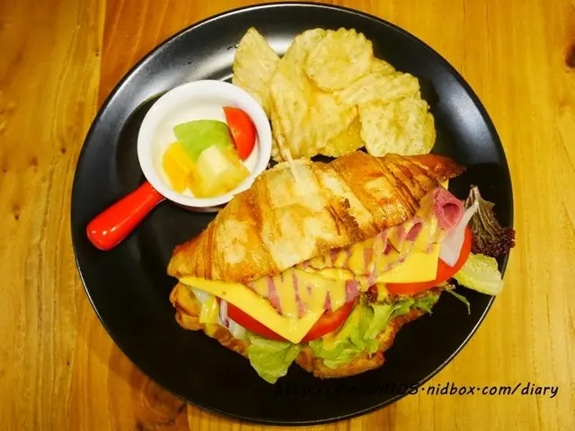 可頌的SIZE頗大,就像牛魔王的牛角般,搭配無鹽薯片,水果,健康又美味