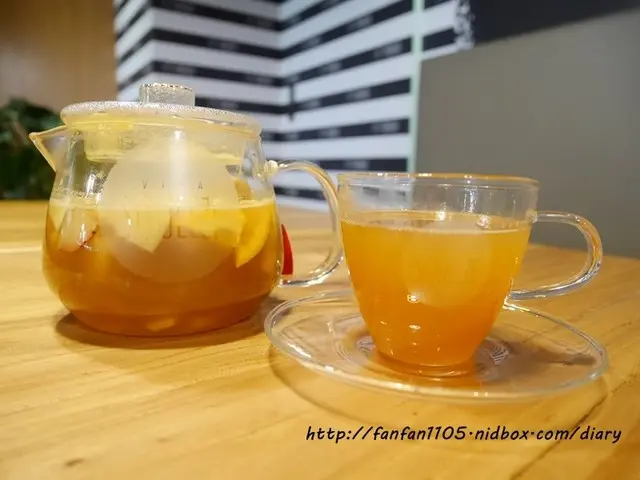 使用TWININGS茶包加入柳橙、鳳梨、芭樂、蘋果等新鮮水果,沖泡而成,隨著沖泡的時間愈長,水果的果酸味也慢慢的散發出來
