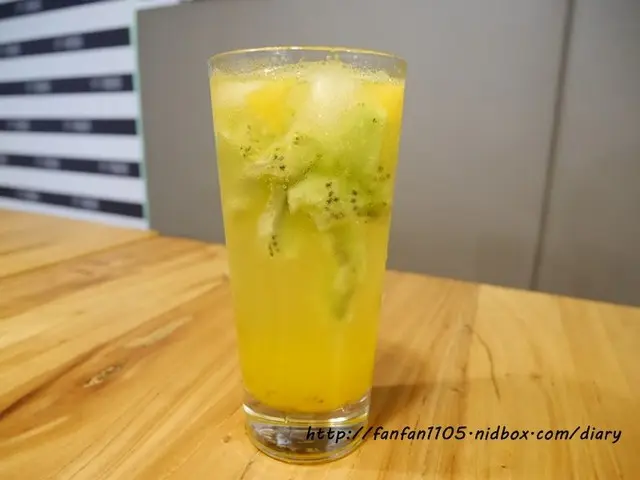 使用奇異果、檸檬、芒果調製而成的,喝起來就像喝汽水般的感覺,但比喝真汽水健康多了