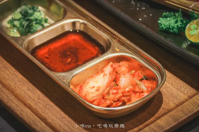 一旁的醬料有泡菜、蔥鹽、和風洋蔥醬、黃金蒜片、柚子鹽,不夠都還可以續,泡菜很好吃,柚子鹽配上偏油的肉品很解膩喔