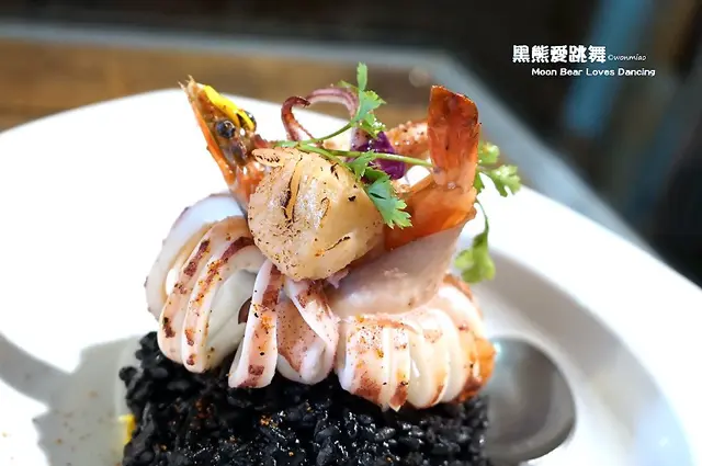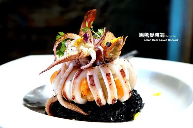 新鮮墨魚汁做成黑嚕嚕的燉飯,飯上豪邁的放上一整隻澎湖小卷,