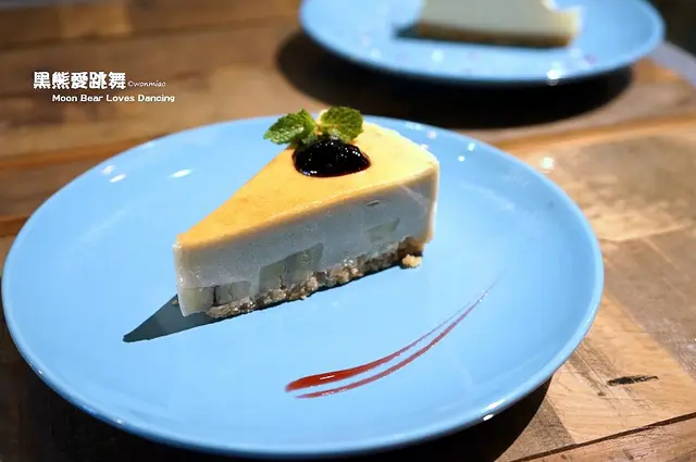 香蕉打成醬並保留些許香蕉切片作成的起司蛋糕,搭配台灣在地食材有機桑椹醬,