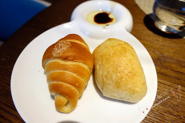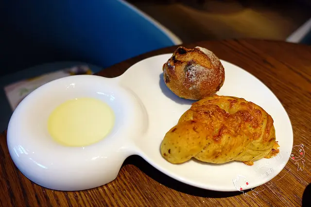 用餐前看到這個是什麼?原來是橄欖油,旁邊是放麵包的,盤子設計就很有巧思!送上來兩個麵包圓的是紅酒桂圓與青蔥麵包