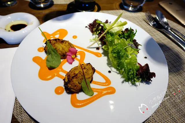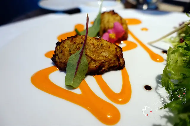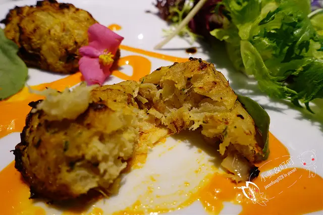 鮮蟹洋芋煎餅配繽紛生菜佐紅椒汁