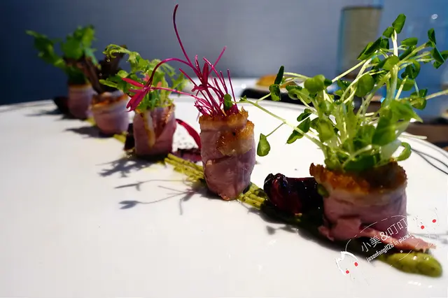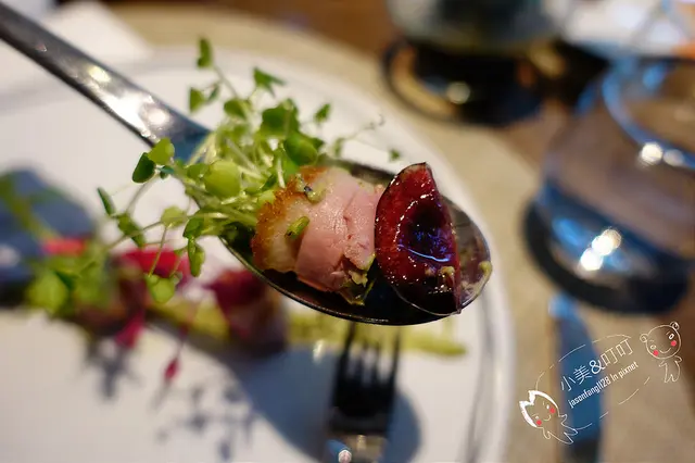 旁邊是櫻桃一口鴨肉配一個櫻桃是最棒的吃法,你有沒有發現五捲鴨胸內的生菜都不一樣?主打健康養生歐法料理!