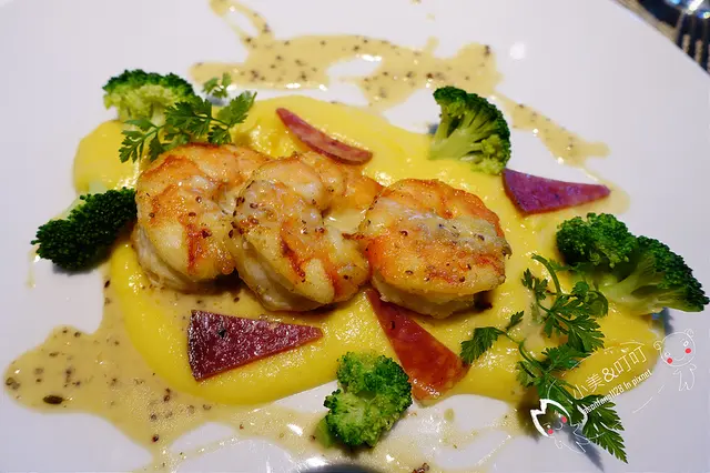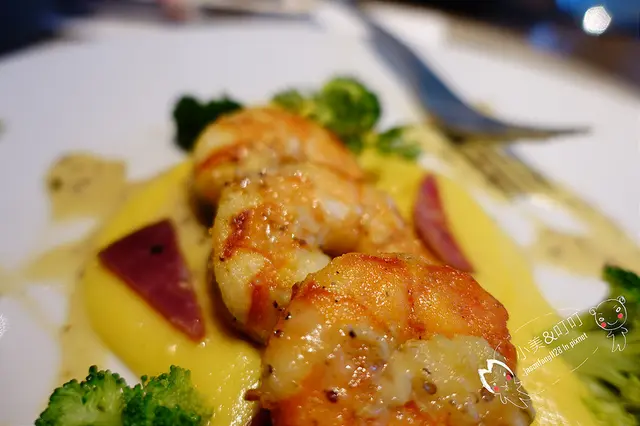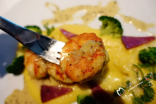 但是這蝦子其實還滿大的!肉質吃起來非常的彈牙很Q而且很有蝦的甜味,底下的法式芥末奶油吃起來不膩口