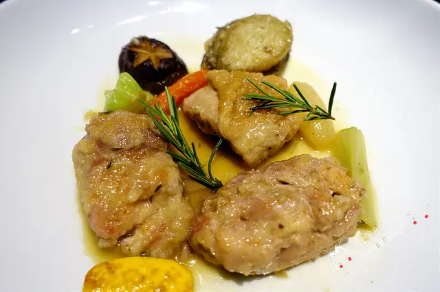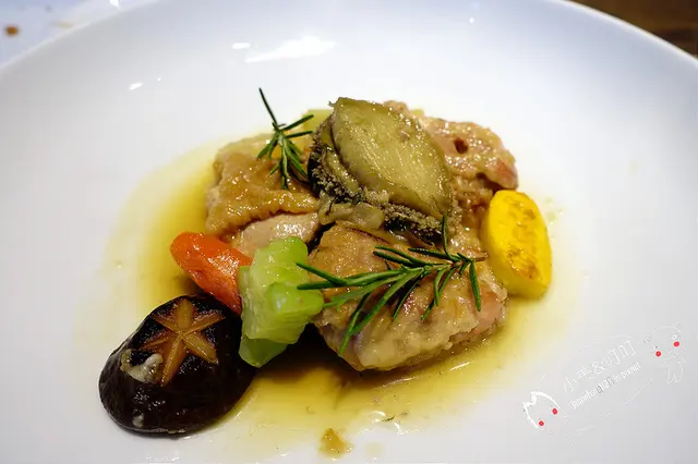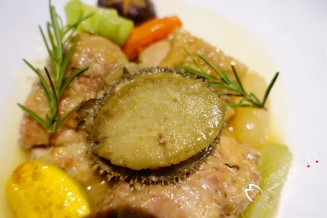 嫩燜雞腿搭柔煮鮑佐白蘭地肉汁