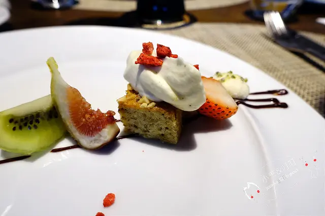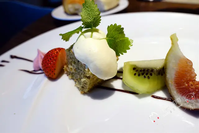 非常的爽口不會有一般奶油的那種油膩感,蛋糕類似香蕉蛋糕的口感,搭配水果吃層次更豐富
