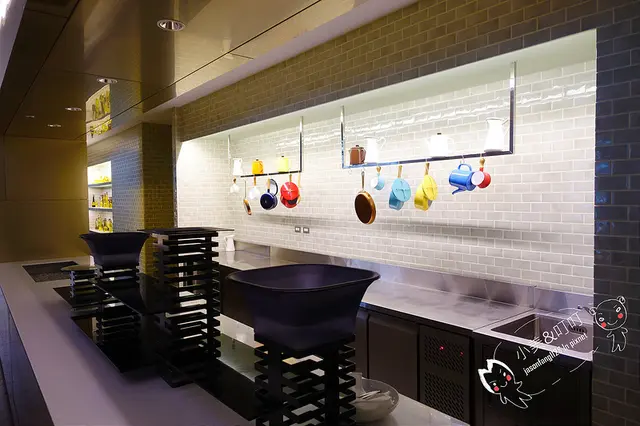 我看到旁邊有一平台原來這裡是早餐的 Buffet 區後面的鍋碗還真是一門裝置藝術