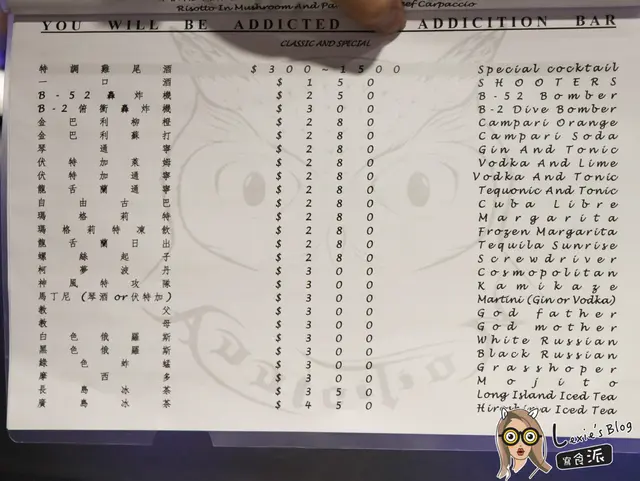 『Addiction 癮餐酒館』空間不大但是挺有氣氛,有餐有酒,如果不太喝酒的人也有燉飯、炸物,沙拉等選擇,喜歡喝酒一定要讓調酒師替你特調一杯專屬的調酒,是個下班聚聚的好所在!
