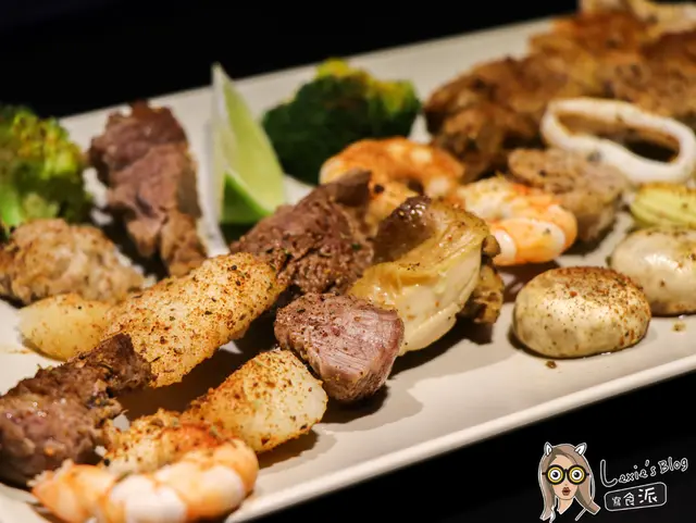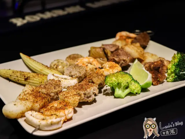 送上來兩隻肉串都在熱騰騰的冒煙,裡面有鮮蝦,牛肉塊,牛肉丸,干貝,多利魚、花枝,雞腿肉,種類很多,旁邊則有花椰菜與玉米筍,