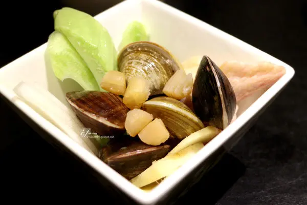 裡頭有芥菜、蛤蜊、雞翅、干貝及薑片。