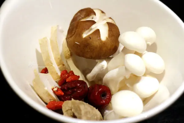 有鮮香菇、袖珍菇、鴻喜菇、雪白菇、金針菇、高麗菜、枸杞及紅棗。