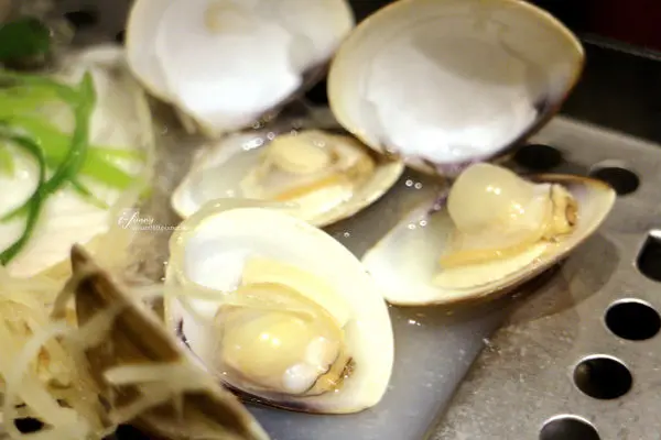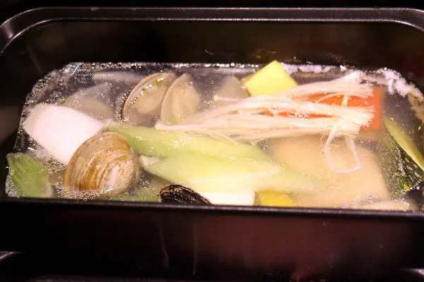 在剛剛的涮鍋上方放上蒸盤,蛤蜊蒸後的鮮甜湯汁就直接滴到湯裡頭,一點都不浪費。