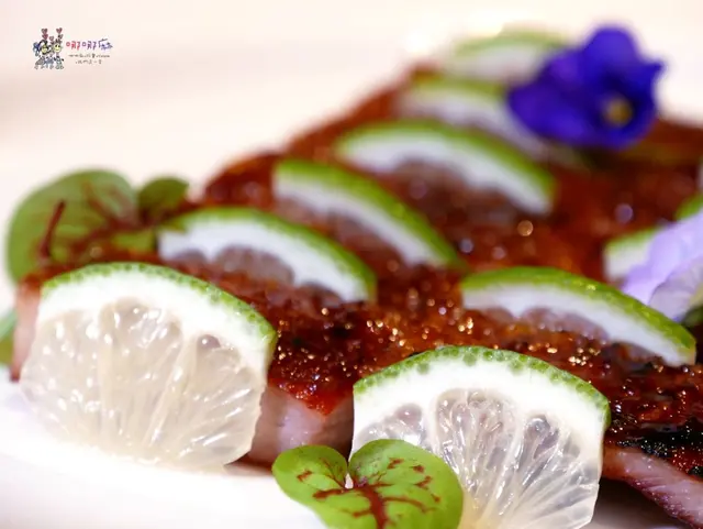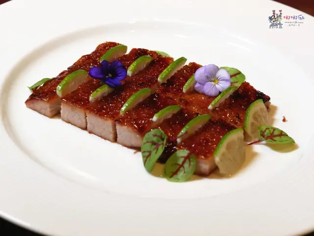外表很漂亮的香檸焦糖松阪豬,這是非常好拍的一道菜,裝飾的也太美了。