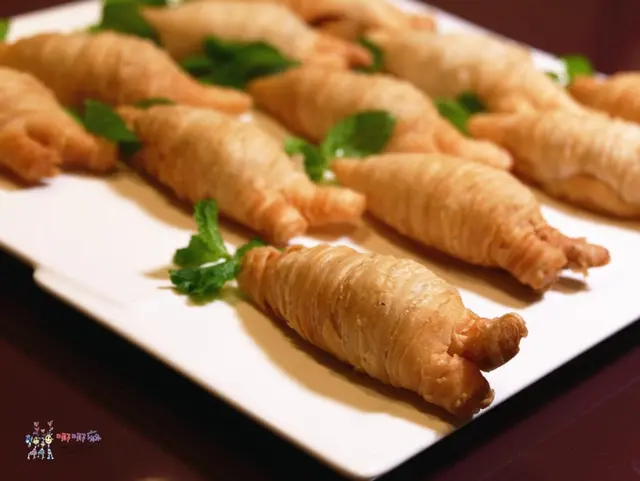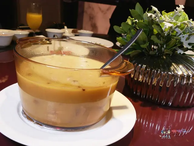 吃完飯就是點心時間,今天有四道點心,第一道是蓮蓉人蔘酥。外表做成小小的人蔘形狀,非常可愛,用白蓮蓉和人蔘粉當餡料,外面的酥皮一層一層的,又香又酥,也沒有人蔘的苦味,是蠻好吃的中點。