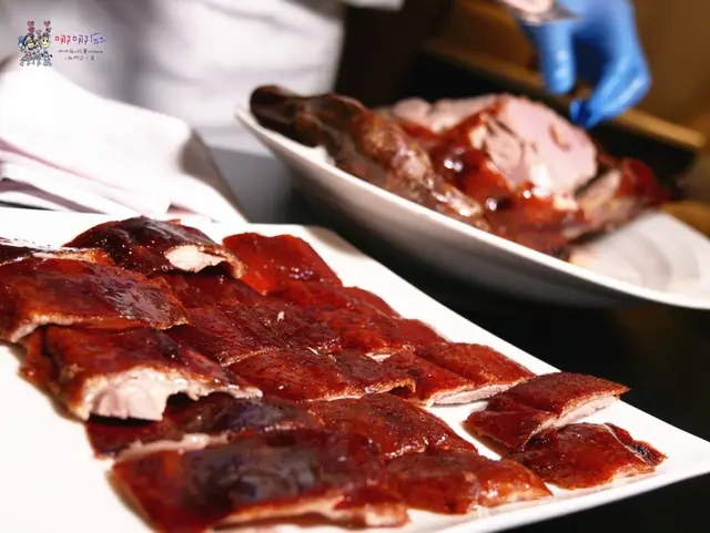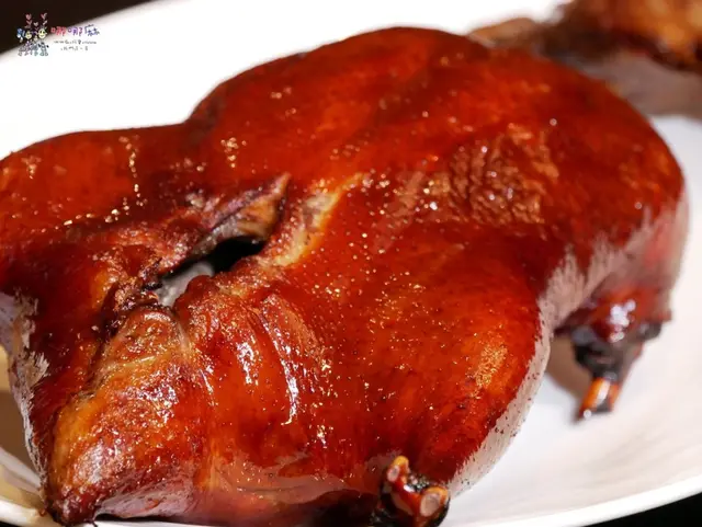 鴨用的是3公斤左右的櫻桃鴨,用特製鴨鹽先抹在上面,然後塗上乳豬醬,再加入八角和肉桂葉後縫合,再淋上醋水風乾一夜,隔天進烤箱烤一個小時,上桌前再用120~140度的油,才有桌上這隻外表看起來油油亮亮的靓皮烤鴨。師傅用刀背在鴨皮上一刮,就發出卡卡的金屬從硬物上刮過的聲音,可見這皮有多脆。