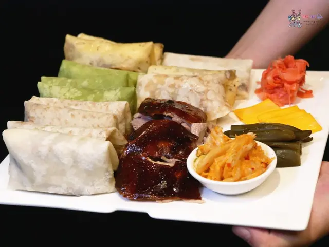 餅皮包裹著剛片好的鴨肉真的非常的香,可以自己搭配旁邊的剝皮辣椒、起司之類的配菜一起吃,味道會更豐富多元些。