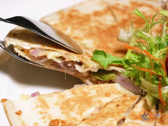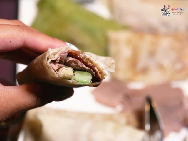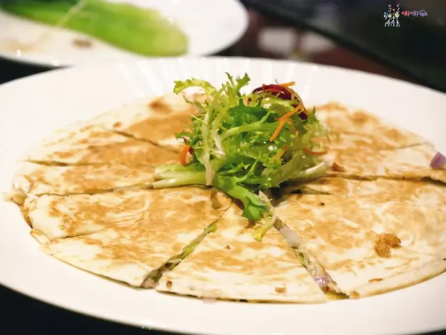 這薄餅的餅皮比較像薄皮披薩那樣的帶有脆度,裡面夾進烤鴨和一些洋蔥,還有起司的香味,吃起來不會乾柴,反而洋蔥本身就會出水,讓這個薄餅的味道更清爽,不至於都是肉的味道而覺得膩口,我想小孩也會喜歡的吧!