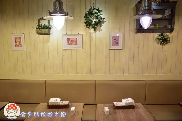 餐廳內黃光柔和,牆上都是可愛的蘑菇女孩畫框