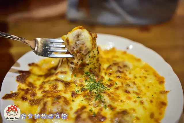 金黃色的焗烤盤上桌,香味四溢,牛肉丸被起給給包圍啦,