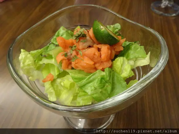 新鮮生菜鋪上煙煄鮭魚切塊淋上特調醬汁再擠顆金桔
