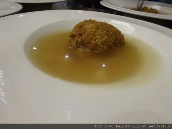 裹上彷如雪花的蛋白,中間一顆生蛋黃,活像超大號的荷包蛋,這就是上海名菜賽螃蟹,妙的是食材裡完全沒用到螃蟹,是一道取名賽螃蟹卻吃不到蟹肉的料理。