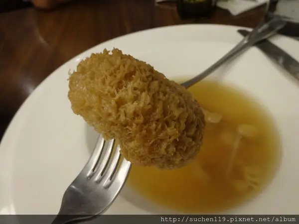 主廚黃來發表示,「這一道菜是皇宮裡面在吃,蛋白那個芙蓉蛋液去過油,再加入魚絲,其實這兩樣東西加在一起,吃起來就像螃蟹的味道和口感。」
