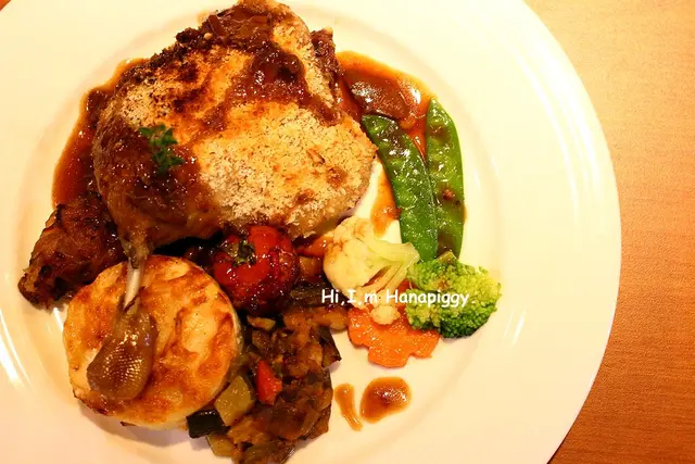 在盤子上看起來十分完整的鴨腿,沒想到叉子一碰到鴨肉的瞬間,肉立刻和鄰居們分了家,流淌出的湯汁就在燈光下閃耀著。油封鴨腿的肉極度柔軟,肉質鮮甜,在口中不必咀嚼便自動化開,令人驚豔的是,它的鴨皮比油炸過得酥脆,而鴨肉竟然還軟嫩甚於燉煮,同一個食材裡擁有如此極端的口感,很難較人抵抗這種誘惑。搭配一些牛肝蕈醬及普羅旺司燉菜一起食用,南法風情,順時而生。