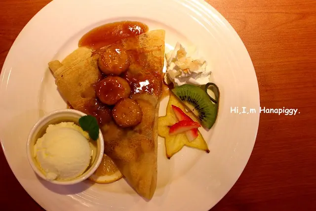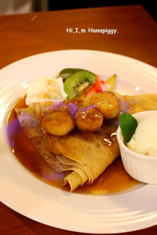 甜的薄餅則是使用一般的白麵粉製作,煮過的香蕉加上萊姆酒的香味,綿密的香蕉口感搭配薄軟的餅皮,層層堆疊,像極了千層派。單吃可麗餅是溫熱的,若搭配一旁的香草冰淇淋,則出現的是有冰火五重天的感覺。