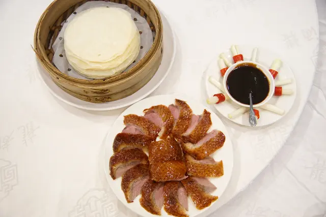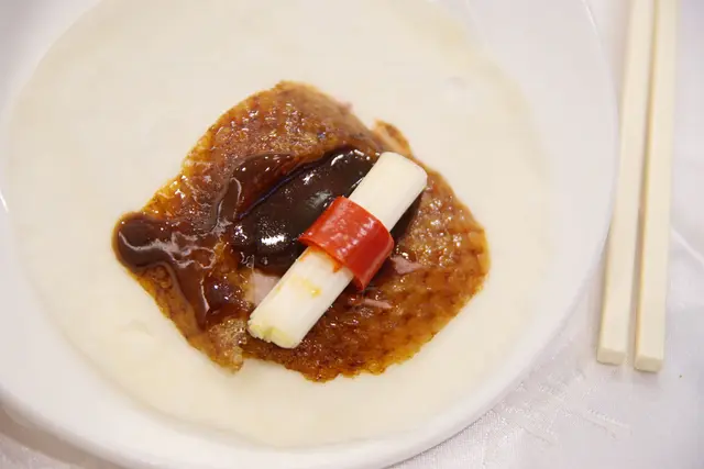 搭配上熱騰騰的糢糢餅,拿一片夾入鴨皮+肉及蔥白、再塗抹上甜麵醬