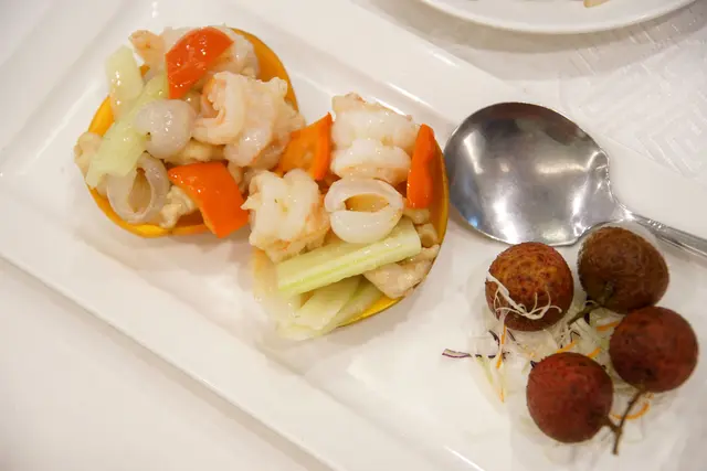 以芒果"皮"為裝盛器具的荔池彩鳳球 nt$560,有好看的器具及新鮮的荔枝、蝦子