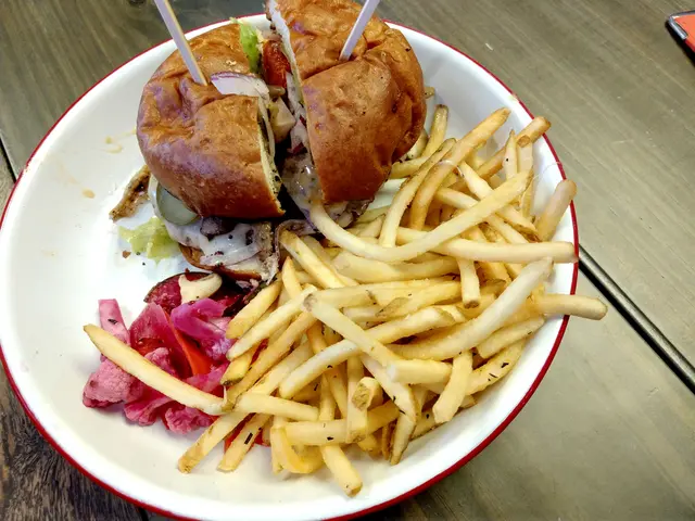夾入了生菜、牛肉、陳年乳酪、烤野菇、烤蕃茄、洋蔥與酸黃瓜並附上迷迭香薯條