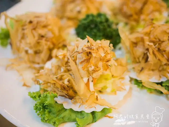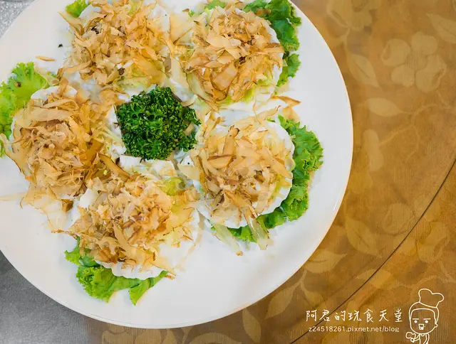 ▼燙過冰鎮後的肥美扇貝,接著淋上美乃滋,並且撒上柴魚片,底下則是清脆爽口的高麗菜,一口吃下去就對了。