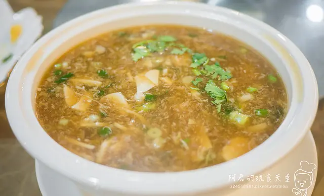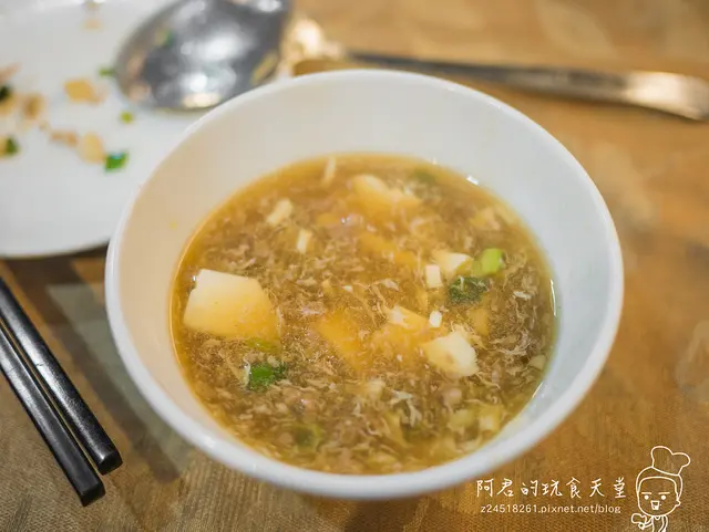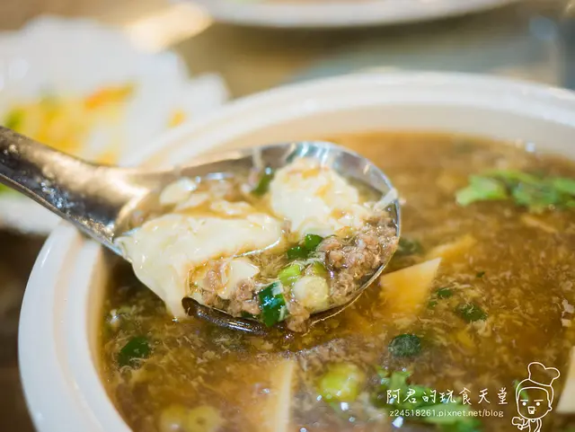 ▼牛肉羹,以牛肉末跟豆腐塊,勾芡後煮成的羹湯,湯不至於太稠,喝起來非常滑順,湯頭帶點酸提味,與帶黑胡椒的微辣牛肉末,相互襯托。