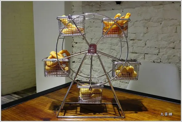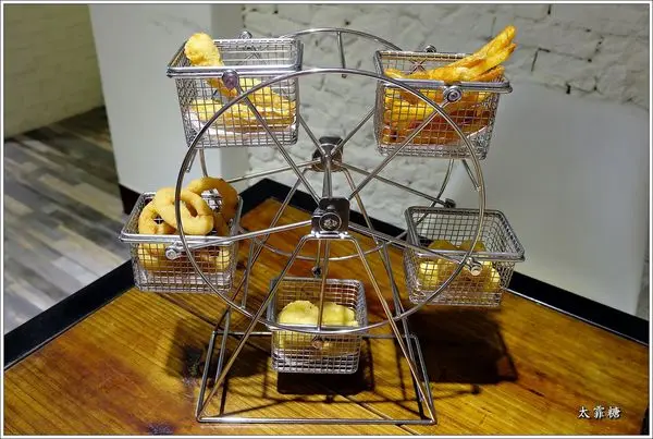 摩天輪上面有5種炸物,雞柳條、雞塊、QQ球、薯條、洋蔥圈
