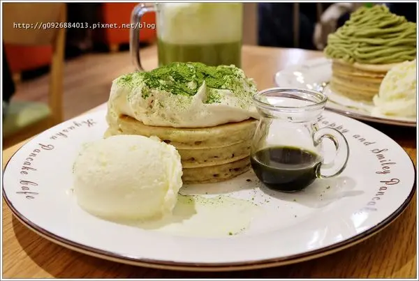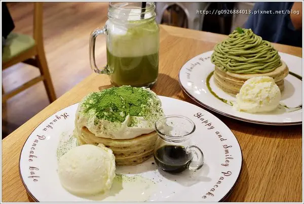 鬆餅加上抹茶蒙布朗泥、抹茶慕斯、鮮奶油