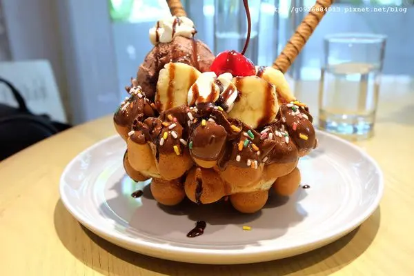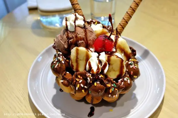 雞蛋仔做成杯狀,裝著香草、巧克力冰淇淋以及香蕉片